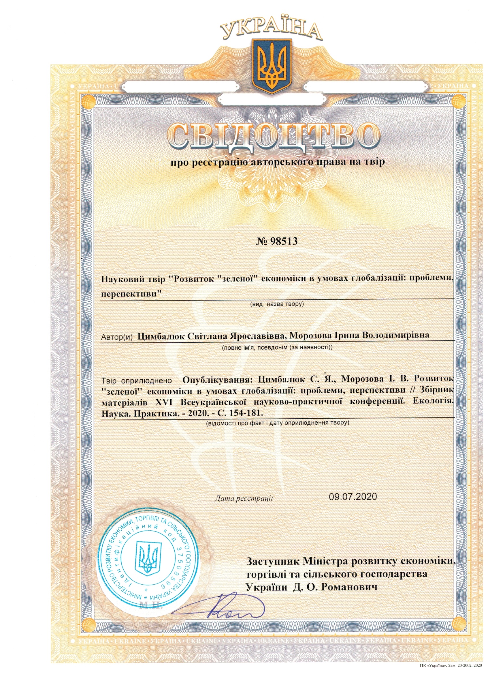 Свідоцтво про реєстрацію авторського права на твір № 98513. Науковий твір «Розвиток «зеленої» економіки в умовах глобалізації: проблеми, перспективи» / С. Я. Цимбалюк, І. В. Морозова. – Дата реєстрації : 09.07.2020 р. ; опубл. Авторське право і суміжні права. Офіц. вісник № 60, С. 67.