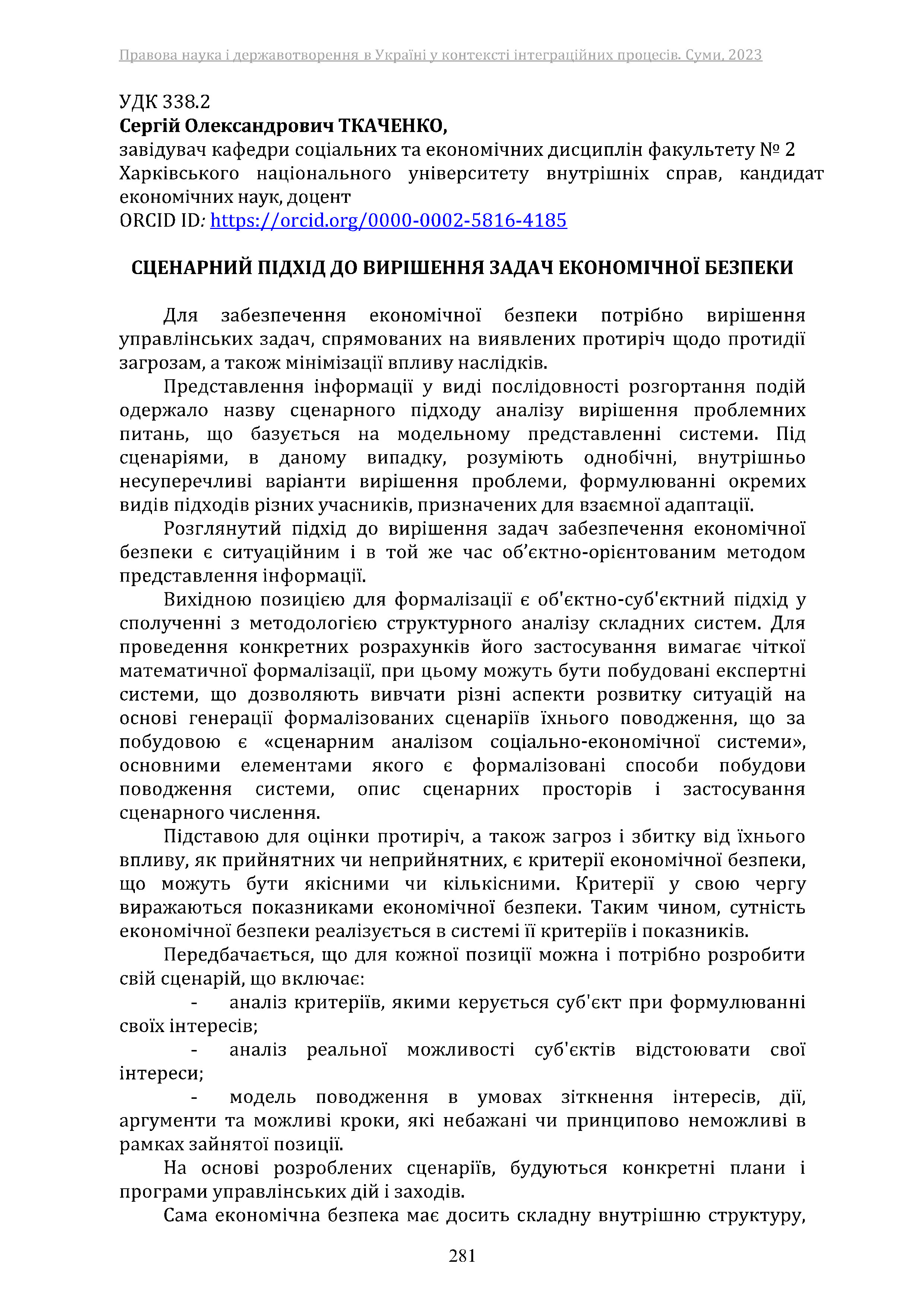 Ткаченко, С. О. Сценарний підхід до вирішення задач економічної безпеки / С. О. Ткаченко // Правова наука і державотворення в Україні в контексті інтеграційних процесів : матеріали ХІV Міжнар. наук.-практ. конф., м. Суми, 19-20 трав. 2023 р. / МВС України, Харків. нац. ун-т внутр. справ, Сумська філія. – Суми, 2023. – С. 281–282.